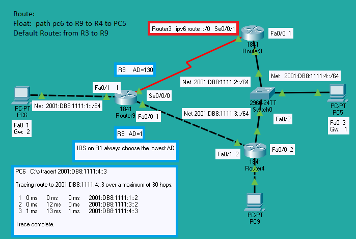IPV6 Serial Configuration | IPV6 Route Default and Float Schematic | IPV6 Route Default and Float Configuration | Show IPv6 Interface | Show IPv6 Interface Brief | Show IPv6 Route |